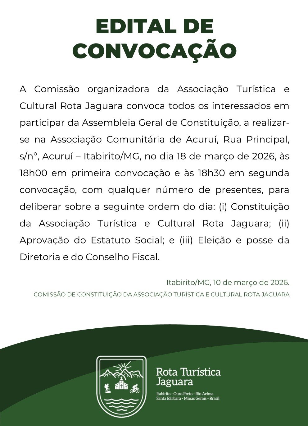 O edital foi publicado pela Comissão de Constituição da Associação Turística e Cultural Rota Jaguara, em Itabirito, no dia 10 de março de 2026.