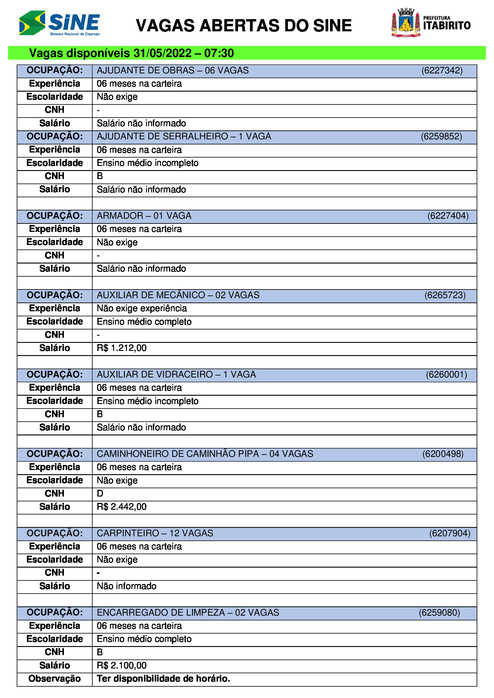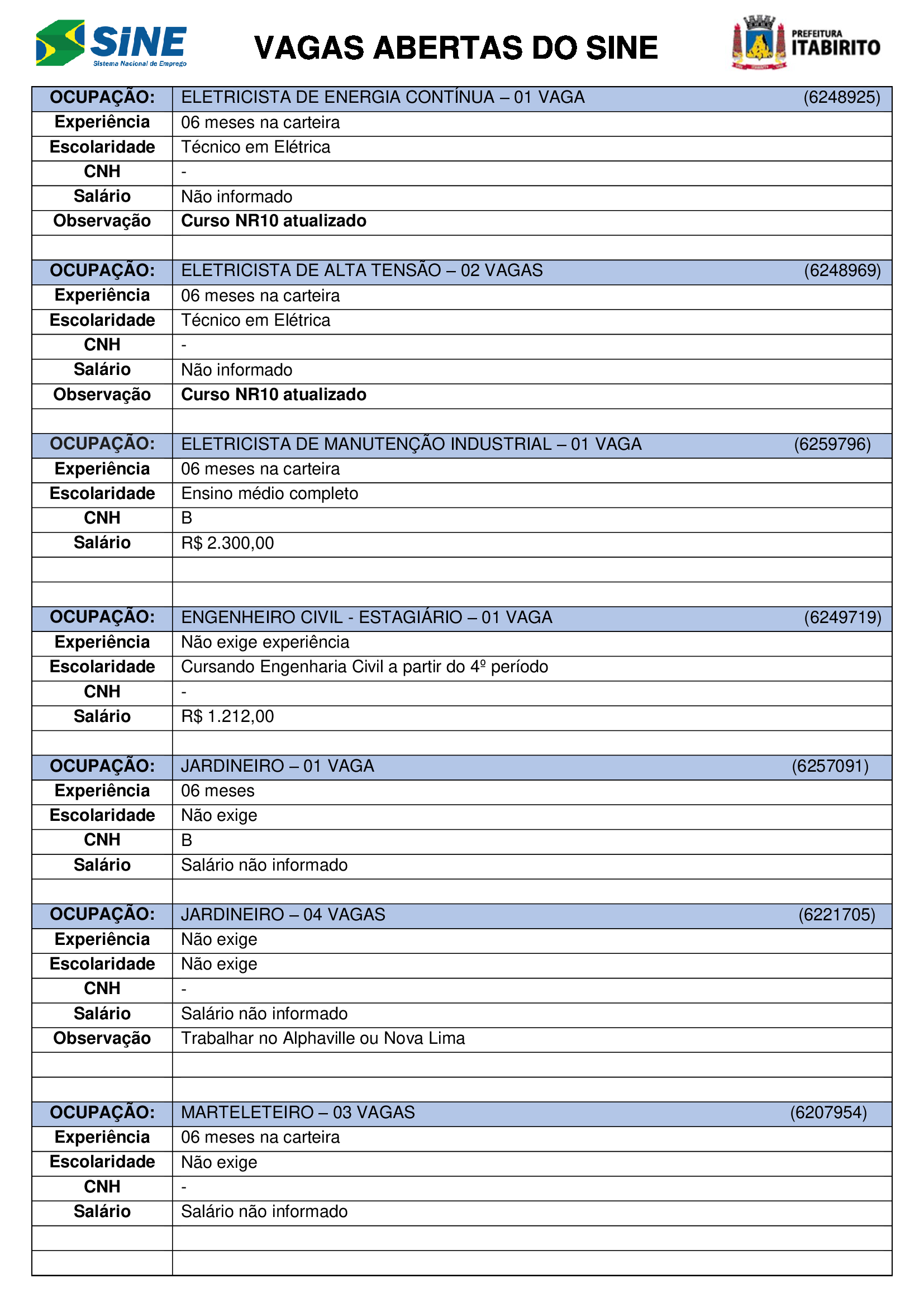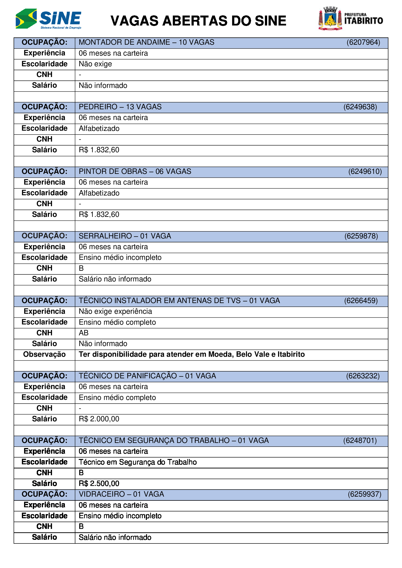 As empresas contratantes exigem do(a) candidato(a) residência em Itabirito. Outros detalhes sobre as vagas de emprego são fornecidos apenas em atendimento presencial no SINE Itabirito.